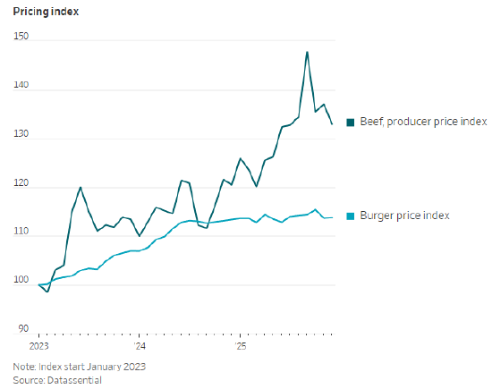 尽管牛肉成本大幅上涨(过去 12 个月行业常用碎牛肉批发价上涨 48%),快餐连锁仍在为汉堡类产品提供折扣。