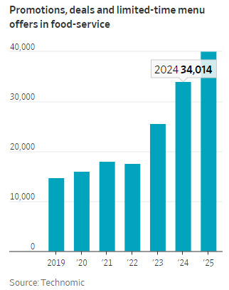 2024 年起,快餐门店客流量开始下滑,迫使麦当劳、塔可钟、汉堡王等品牌加大优惠力度。市场研究机构 Technomic 数据显示,美国汉堡连锁品牌去年推出约 3000 项促销活动,数量接近 2019 年的三倍。