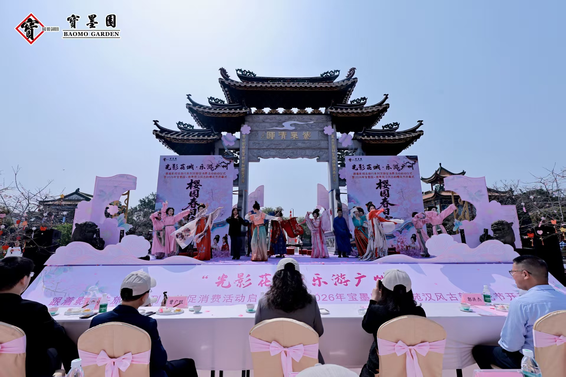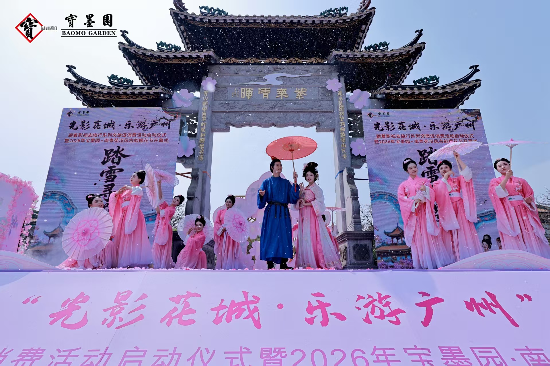 3月8日,“光影花城·乐游广州”跟着影视去旅行系列文旅促消费活动启动仪式暨2026年宝墨园·南粤苑汉风古韵樱花节开幕式,在宝墨园正式拉开序幕。该活动由广州市文化广电旅游局指导,国家对外文化贸易基地(广州)与宝墨园主办。